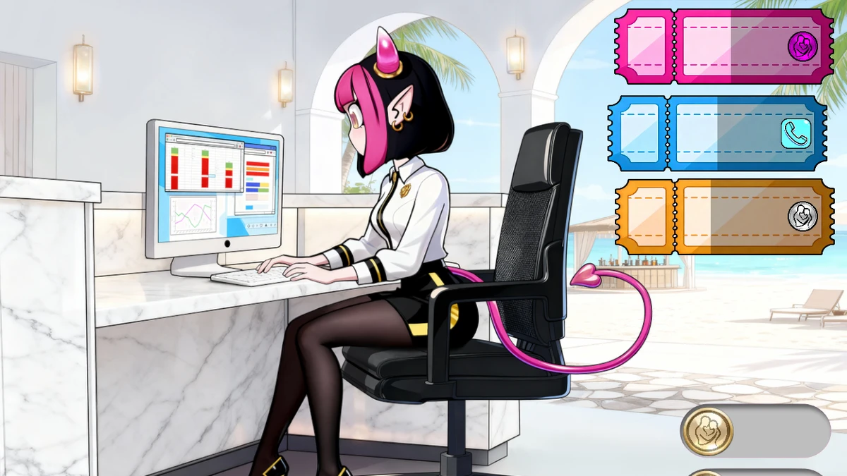 Step into a fast-paced routine of shifting priorities, productivity demands, and unexpected interruptions as you try to keep the resort running smoothly. Each level challenges you to manage your workload, maintain momentum, and react to events that can either help you stabilize your shift—or push you into increasingly erotic situations.