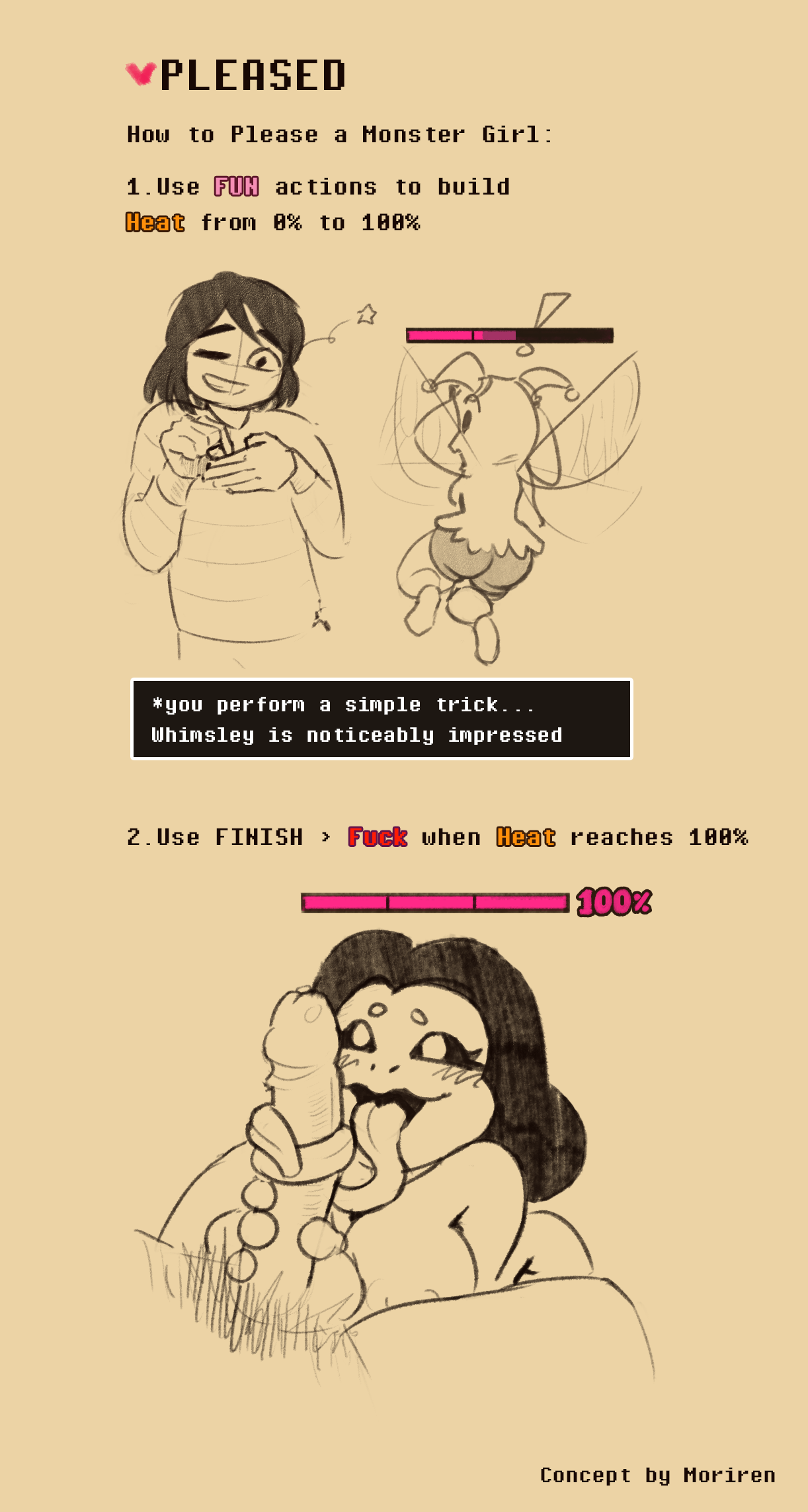 Killing vs Mindblowing - In Undertale, the player is given the choice to FIGHT enemies, lowering their HP bar until they are killed. In UHT:LL, the equivalent choice is to have FUN with enemies, filling their LP (Lust Points) bar until it is maxed out. This leads to a sex scene that leaves the enemy Mindblown, resulting in state of mind-break and corruption of monster’s character.